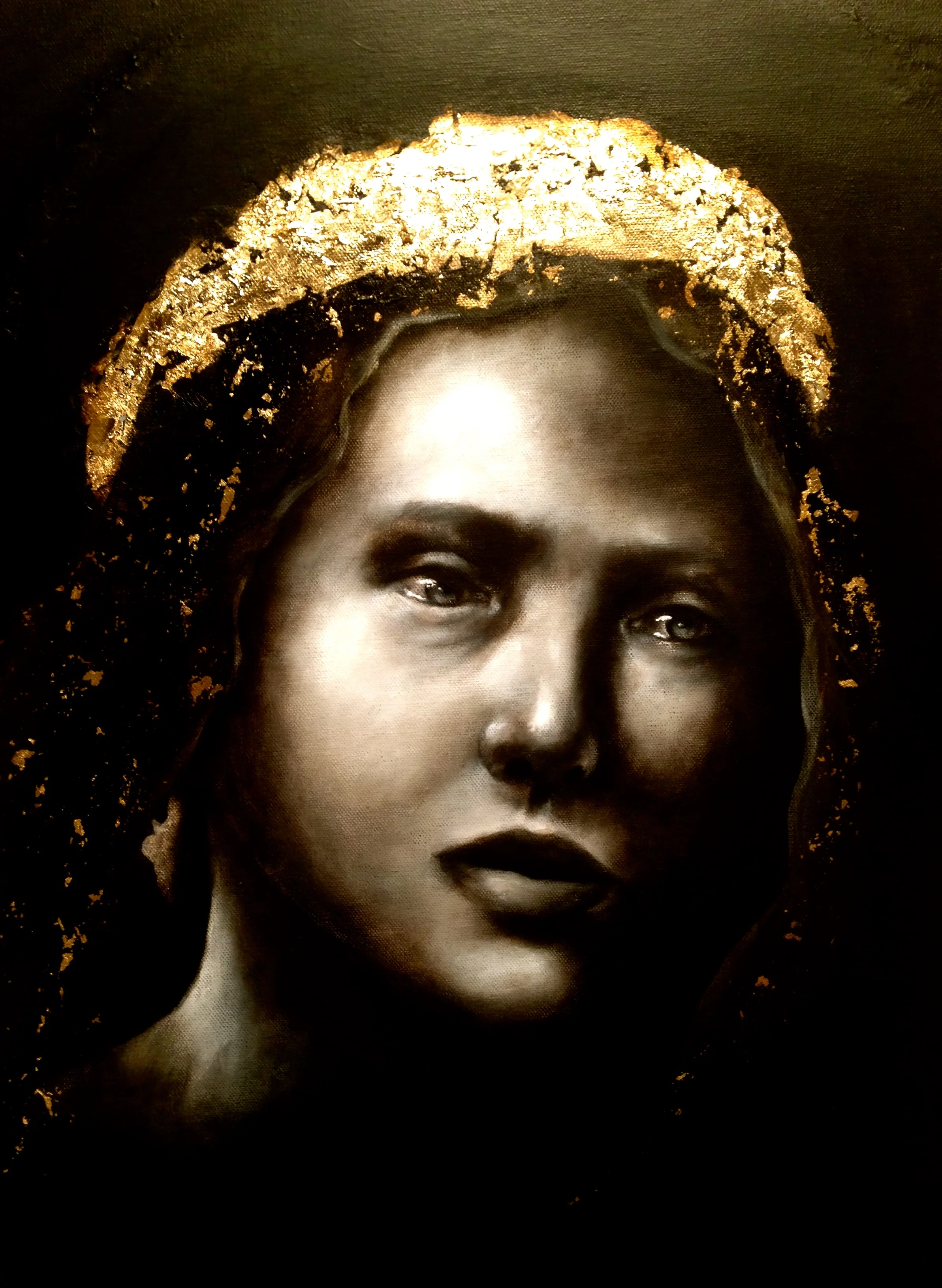 Acrylic, oil, texture medium, gold/silver leaf on canvas